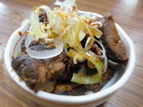こちらがお通し。山盛りチャーシューにネギはうれしいです。